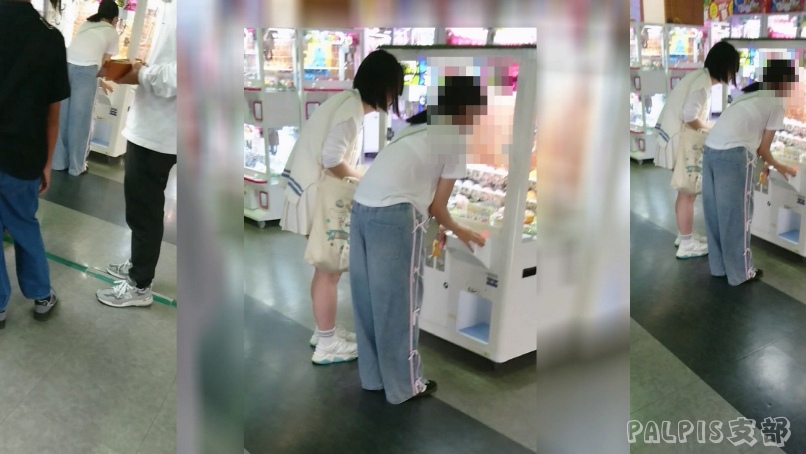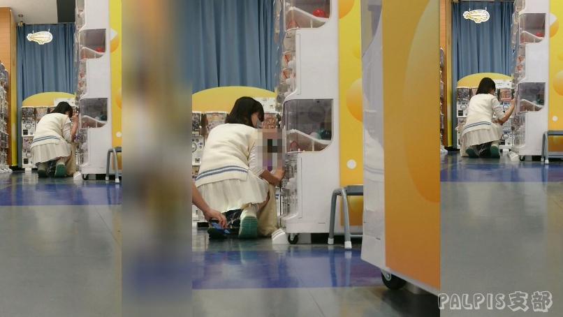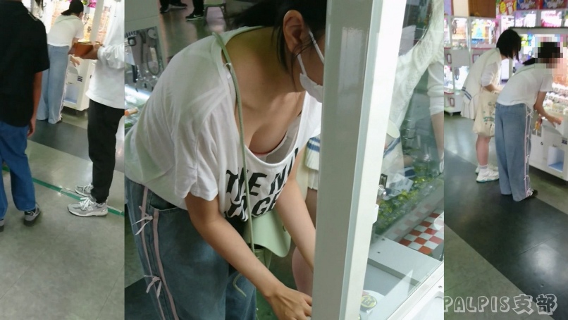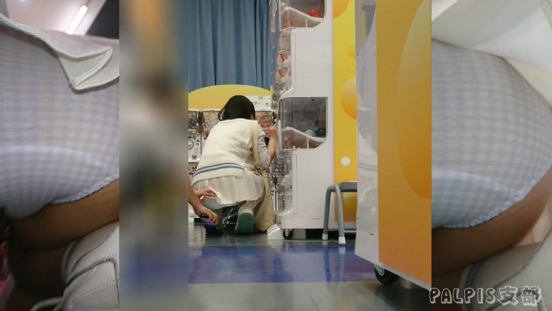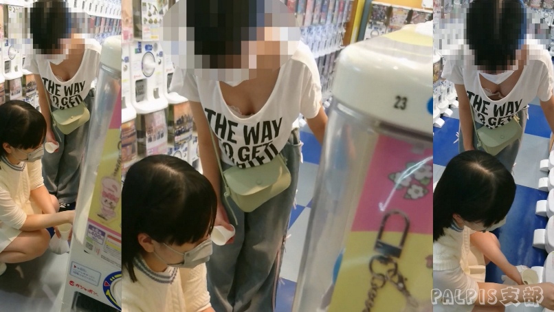 スカートモデルさんがしゃがんでガチャガチャをやっているとき、それを興味深そうにのぞき込むモデルちゃんの胸元が!