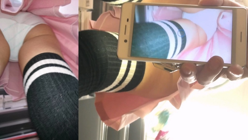 パンツを撮影しつつ、指先でスカートの裾をめくりあげる…!